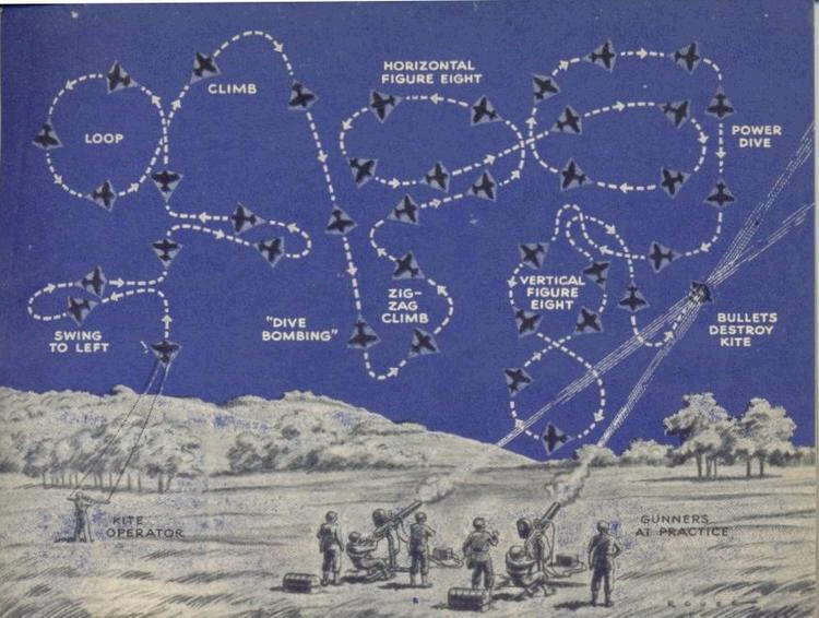 They started with a dual line Eddy kite-developed from a Malay design of a half-century earlier. The five-foot diamond kite had a rudder system for steering but no tail. The kite was designed to duplicate airplane maneuvers- loops, dives, figure eights, and was flown on 250 feet of line to simulate the size of an attacking plane.